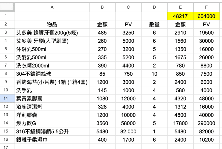 我一開始也以為 10,000 PV 要買很多,結果第一次購買就超過了。那次我只是買了: