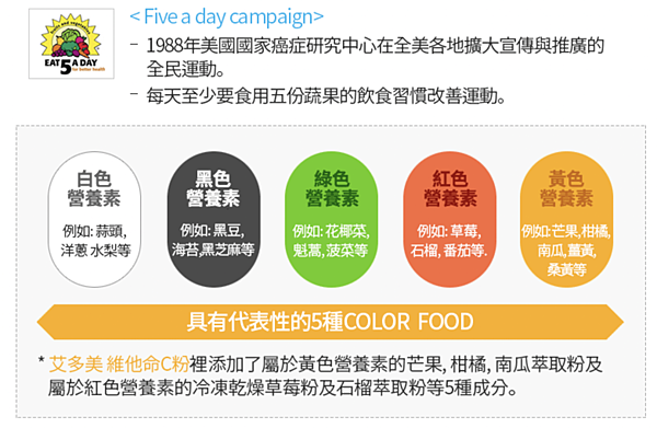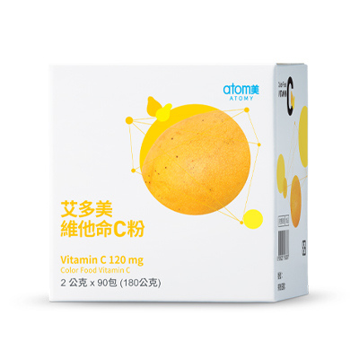 「艾多美維他命C粉」全天然萃取,每包含有120mg的天然維他命C,更加入芒果、柑橘、南瓜、草莓和石榴五種副原料,一天五蔬果飲食計畫一次滿足!