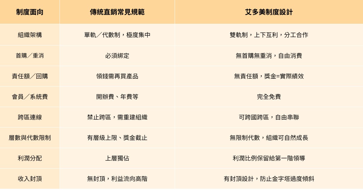 艾多美不靠話術吸引人,而是用制度保障普通人能安心參與。對比傳統直銷,它的制度設計從一開始就避開了對新手最不友善的幾個風險: